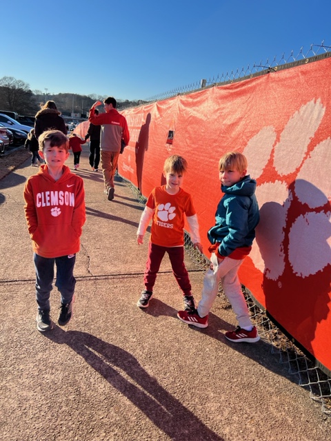 Sure enough I did finally fall asleep, and the sun did rise the next morning, but not before the stomping of little feet on the stairs and the high pitched shrieks emanating from the first floor woke me up. That morning as all the adults made conversation and the children ran through the house practicing noisemaking of all kinds, as I fought through a headache and seared 4 batches of pork medallions for sandwiches, the knowledge that come 2:45 everything would change carried me. It was game day. Soon, all I would have to do was drive, walk to the stadium, and deal with concessions and public restrooms. Not only that, but the Tigers had a real shot at beating Duke and going to 7-0. So it was with great relief and anticipation that I saddled back up in the Odyssey, Matt riding shotgun, the boys in the middle row, and Danyelle taking Sammy’s spot in the way back, and twisted down the mountain headed towards Clemson to see a game in Littlejohn for the first time in 15 years, my boys’ first Clemson game of any kind, a game that by some miracle had turned into maybe the biggest home game of my adult life. For the next four hours, my juices were flowing. Lack of sleep was no matter. The Tigers put on a show to remember, surging in the closing minutes after trailing for most of the second half and putting Duke away, finally winning by 8. After some early first half changes to our elite seating arrangements, the Scott Hog ended up on the aisle next to his mommy. He went with her to the bathroom and took a dump early in the second half. I ended up at the other end of our row, in between Hiller and Cartter, whose engagement with the goings on was easily the most enjoyable aspect of the entire experience. Cartter was clenching his fists and giving the yes pump at appropriate moments, periodically turning around and inspecting the fans behind us who were cheering for the wrong team, and slowly waving a dirty tattered napkin to conjure good juju. He housed two hot dogs with ketchup and sipped a coke, no fussy bullshit like cotton candy or pizza or whatever, not even nachos. Late in the game, Dan told me Hiller wanted to switch seats with me to sit next to Cartter. Reluctantly, I obliged; however, after the tide turned for the worse in the game, I feigned superstition as an excuse to switch back and sit next to my boy. Wouldn’t you know it worked? After the seat switch, the Tigers went on a run that sealed the deal. As Clemson was icing the game, Cartter, who had switched from the napkin to the free t-shirt that all the fans got that day, turned to me and said, “See? I told you. It’s working, because they’re distracted.” Like father like son I guess. Later that night, once we had scaled the mountain and arrived at the house again, while Matt and Dan stayed up late watching Trevor Lawrence engineer an epic comeback in the wildcard round against the Chargers, no amount of self doubt could keep me awake. For one thing, I was really, really tired, and beneath that thick coat of exhaustion was the knowledge that my ultimate goal had been satisfied: my boy had enjoyed himself.
