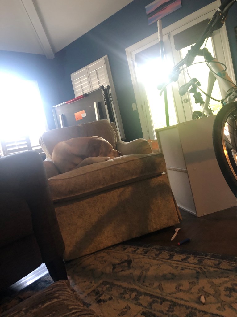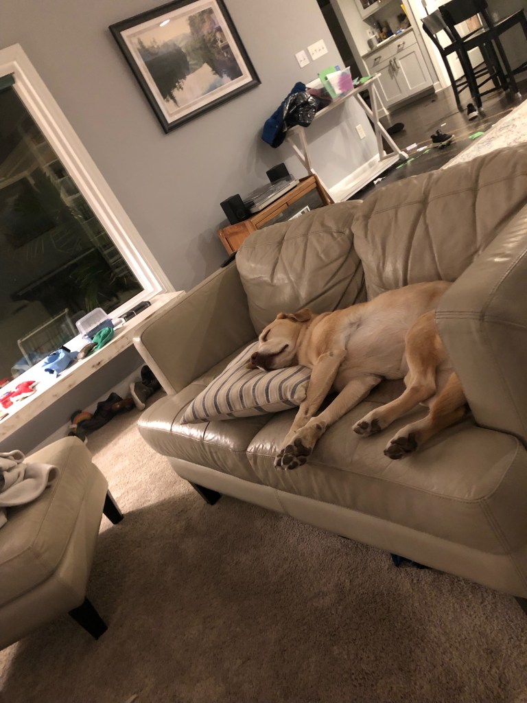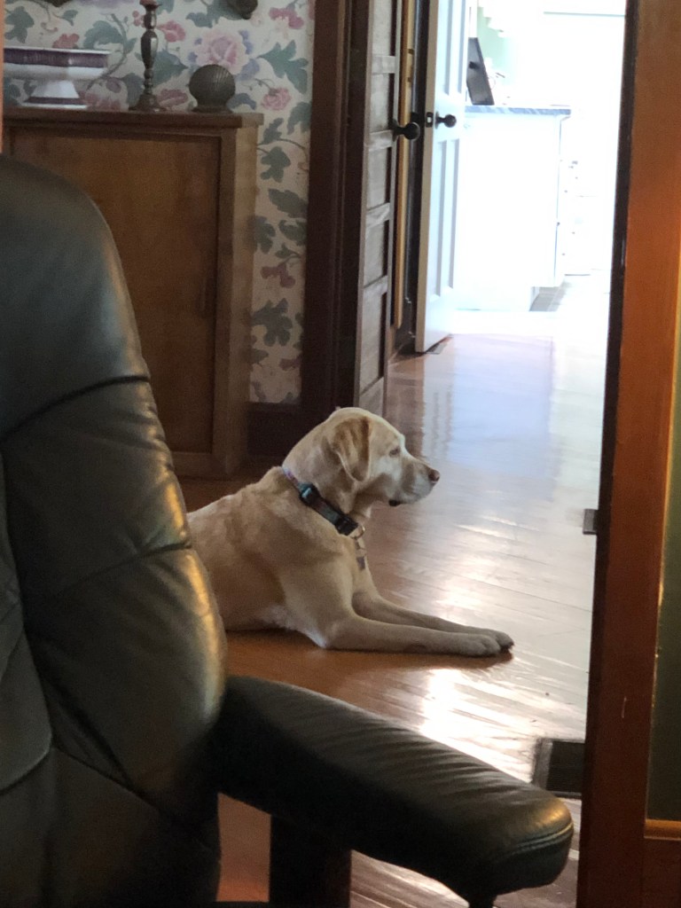 Last night, sensing her just on the other side of the doorway, I got out of bed and closed the door. Only I couldn’t close it all the way. Instead, I closed it halfway and felt it squish against a dog, who frantically and clumsily jumped up and crashed to her left and right before successfully, and noiselessly backing out of the way. I should’ve known. Lying in doorways is kind of Sammy’s thing. She likes to position herself in the one between the kitchen and the mudroom. That passage leads to the most oft used exterior door, and she’ll nap while blocking the opening to make sure that nobody leaves the house without her knowing. Of course, this behavior sometimes leads to her getting stepped on, an apparently necessary evil which she bears soundlessly.