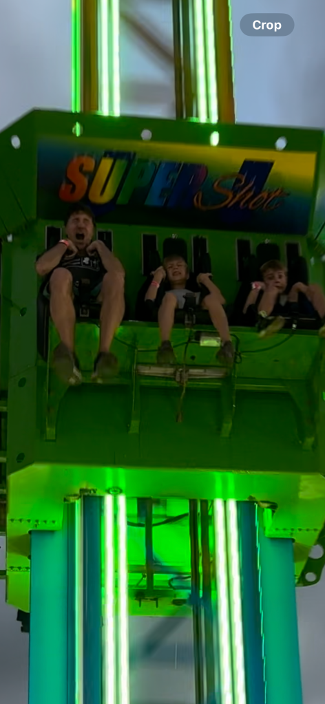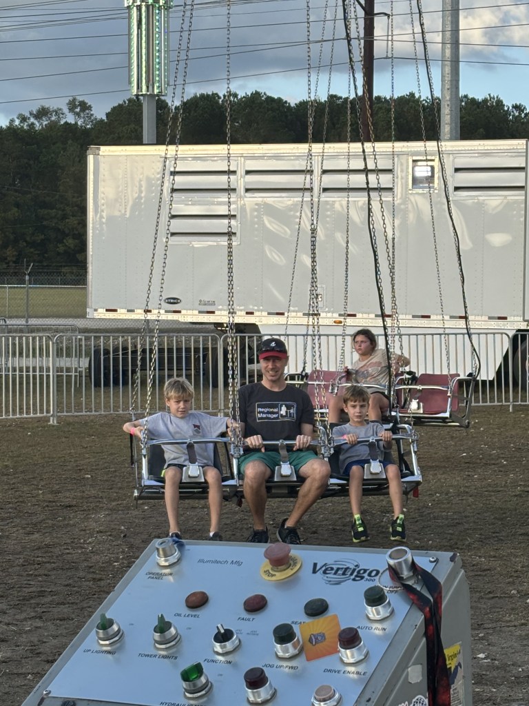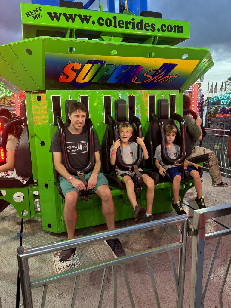 The sun set, and darkness began its soft descent upon the fairgrounds. After a panic-inducing wait for a ride on a swinging boat that saw Cartter’s eyes well with tears and the three of us bail out at the last instant, the boys tested their mettle on a giant slide, the “Kite Flyer,” and the Gravitron. Thank God we didn’t make it onto that boat. Even for the riders sitting in the middle rows (all adults), who weren’t subject to the most dramatic swings, it was obviously trauma inducing. The boys and I narrowly missed being the last to board, and after the ride operator relatched the chain in front of us, before I realized what was happening, both Cartter and Scotty turned and fled to their mother, much to my relief. The boys were mildly amused by the slide; Cartter opened his eyes and matched his brother’s gleeful expression midway through the kite ride; and after exiting the Gravitron – a ride which old strawberry scars prohibit me from entering – they informed Danyelle and me that it was “awesome.” With their spirits running high and me eager to get back in the action, I led them toward the final terrifying test of their newfound manhood.