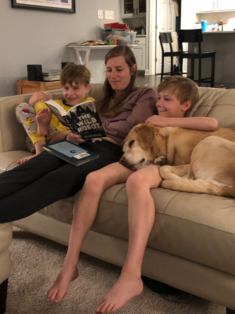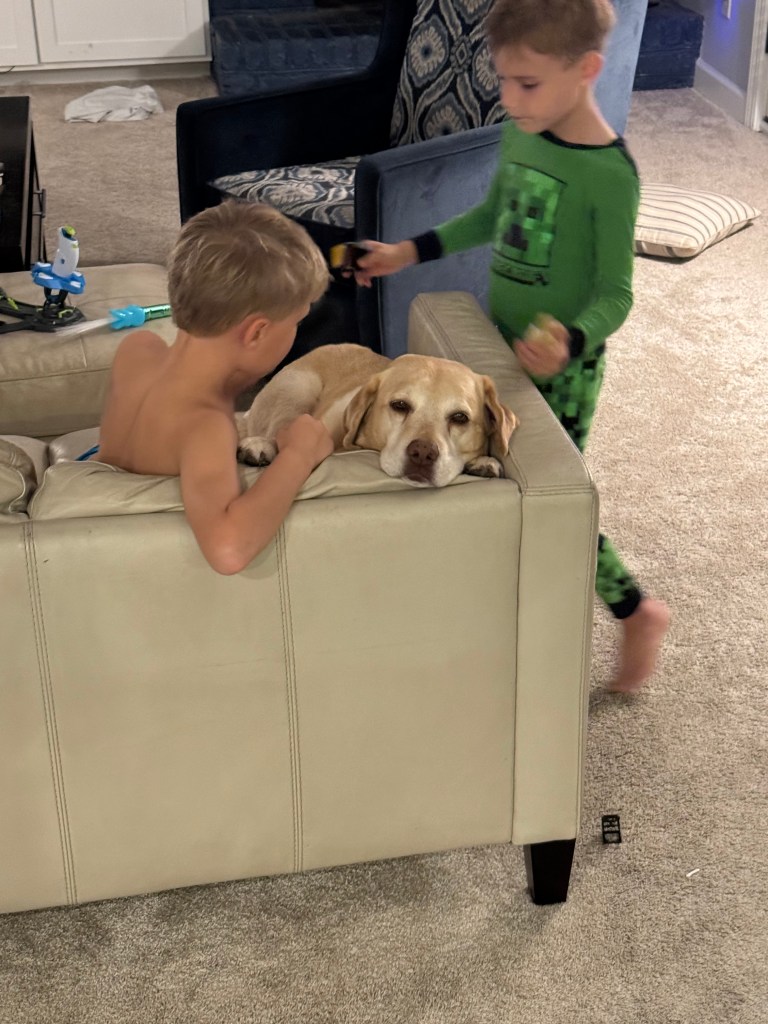 The kids are sensitive to Sammy’s worsening condition too. When I pulled the minivan into the driveway after a night out, I told them they had to go straight to the shower and get ready for bed, and my eight-year-old corrected me quietly, “After some Sammy pets.” I sat at my keyboard and made up a song for them about a mole named Billy whose kinfolk miss him after he falls prey to a marauding dog snout. They cried, so I told them a story about a dog who moves upriver and lives a wild life free from want. They cried some more.