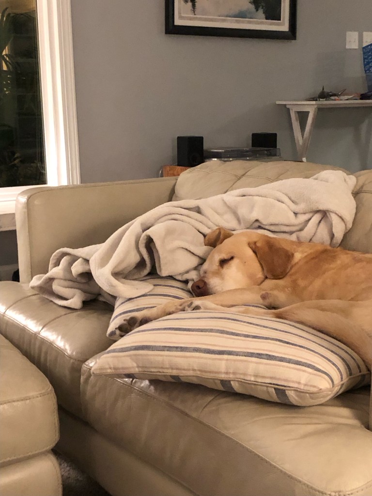 The loveseat is part of a living room set that Danyelle and I bought together when we were first married. We were still very much “young people” then, no kids, still starting out in the world. That day in the store we spent two hours lounging in different furniture and shooting the breeze with a college-age sales rep before landing on the cream-color leather low-back sofa and love seat combo. Sammy’s yellow fur glides right off the smooth leather, but there’s a dark spot in one of the cushions where she’s repeatedly clawed out a place to curl up. When she’s not using it for a full-on nap, she likes to sit in that spot and hang her head and forepaws over the back of the loveseat and face the kitchen so she can keep an eye on things while she dozes. There’s an electric keyboard off to the right, and sometimes when she’s sitting like that, I turn it on and play her song so that she’ll howl along. I play it softer and more slowly for her these days, and when she joins in, the barking and gravelly exuberance of her youth is replaced by a low mournful note, rich and warm in tone, that makes me sad and just a little afraid.