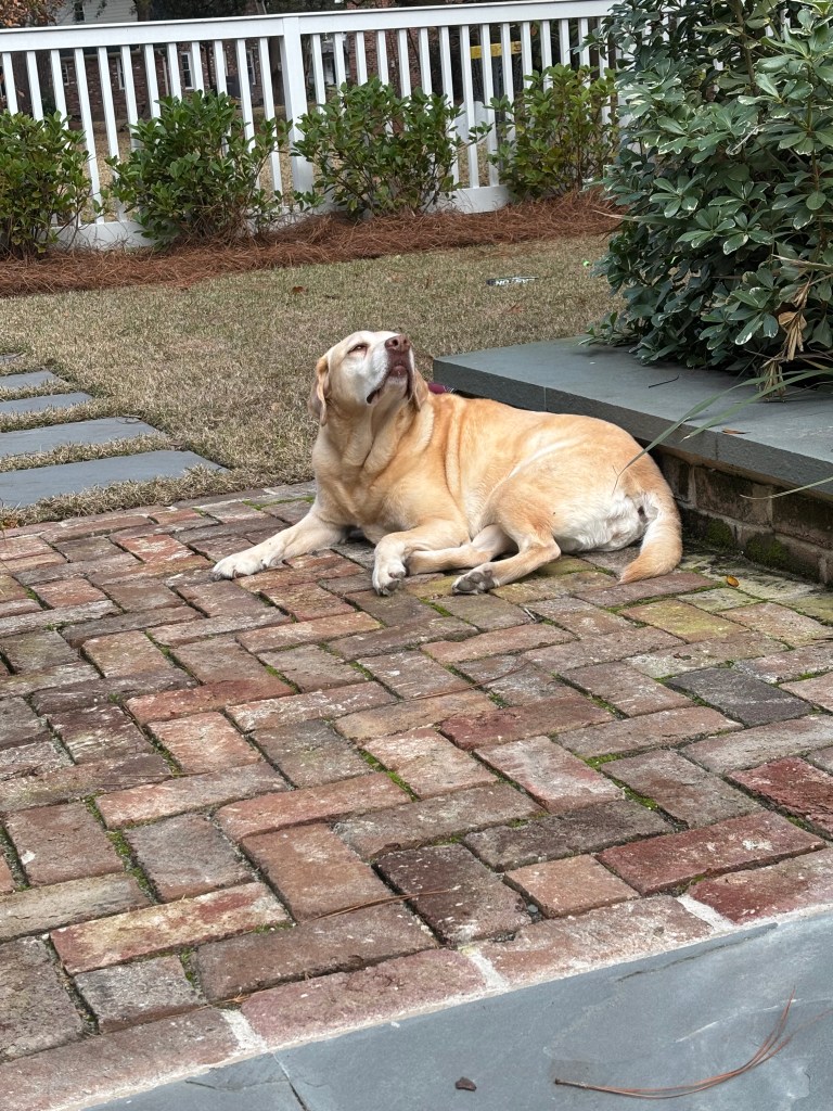 The last time that we failed to contain her, Danyelle and I were especially piqued. It was after 10:30 at night; we weren’t expecting Sammy to be so keen on exploring in the dark; and we were eager to go to bed. When she didn’t reappear at the front door in due time, I took the golfcart out in search of her, creeping over the tree roots in the park access before accelerating past our fence line. I heard her before I saw her. She came up alongside the cart panting and then showed herself in the headlights’ glare. My anger melted into relief, and when I called out, “Sammy!” my voice was like a fawning child’s. Afterwards, her right foreleg was so bad that she couldn’t put any weight on it.