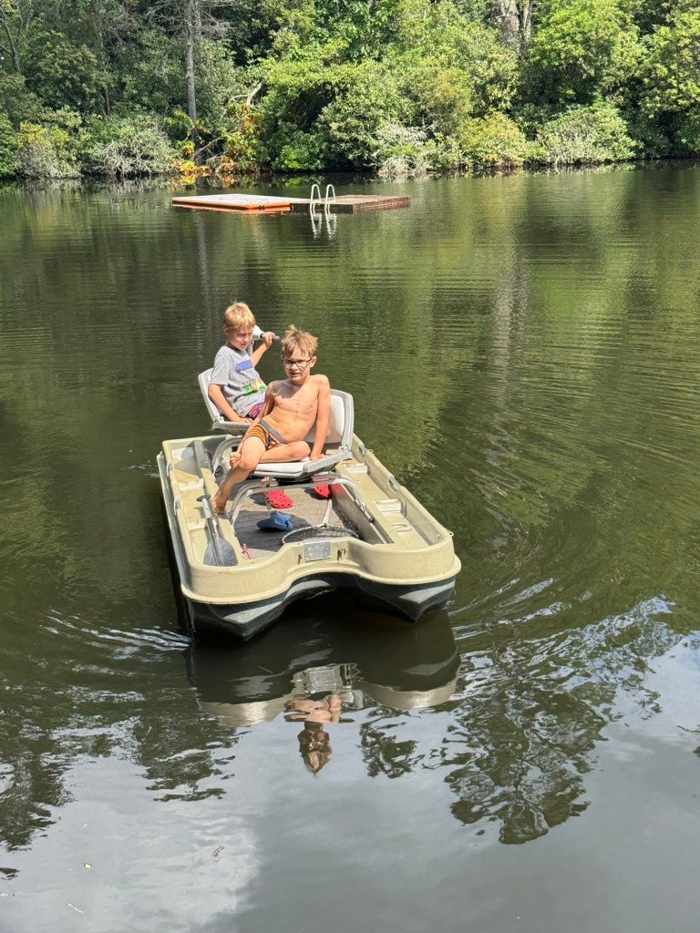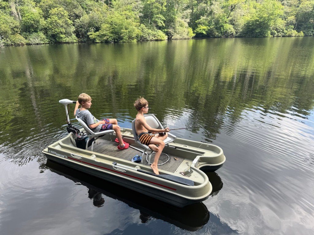 I worried beforehand that Matt might be too much of a distraction, that I’d lose sight of the boys and miss spending time with them, fueling their resentment in the process, but hanging out with Matt turned out not to be like burying my nose in a swimming text. It didn’t deprive the boys of any freedom; there was no need to shush them; and even when Matt and I were ditching them at the boathouse to fish the headwaters, the boys seemed to somehow feel included. This they evidenced by their resolute patience in awaiting our return, and in their persistent efforts at stifling their needier impulses in favor of a burgeoning wee manhood of their own. Cartter started tying his own knots and unhooking his own fish on this trip; Scotty leveled up from the punch and throw to the spinning reel; and when Matt and I docked up, the two of them even took out the little two-seater by themselves, at first to retrieve a lure snagged on a submerged log, and then to make long casts out in the middle of the lake. Cartter worked the trolling motor, much to his delight, and when he snagged in the trees, he navigated into and out of the brush before cutting his line with the pliers. He was very proud of his independent fishing, and the way he talked about his lure selection and his methods reminded me not a little of Matt when he was a kid. Even better, the adoring smile that was lost to me in the days and weeks leading up to our vacation reappeared on his face with frequency and intensity.