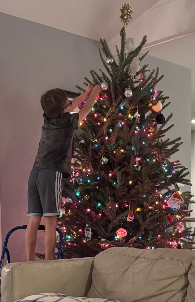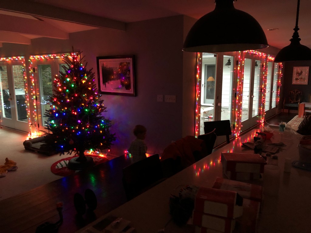 This is the first year I’ve led the lights project since Cartter and Scotty were still toddlers, back when I went Clark Griswold on the French doors that used to line the living room and dining area walls. I strung them with multicolored lights inside and out, five sets of French doors, and the reddish glow was so powerful that it was actually nauseating.