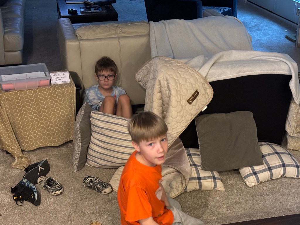 During their week away from school, Cartter and Scotty dominated our house. The instances of Danyelle’s and my subservience were numerous: The living room transformed into a fort with a little sign outside its soft walls identifying the structure as home to “Scott Law,” inside which the boys rolled around giggling and making up commercials about soliciting personal injury suits; in another case, during a moment of extreme intimacy, Danyelle and I were interrupted by a very untimely stream of loud, garbled nonsense, which was apparently Scotty’s impression of some asinine adult (maybe a client of Scott Law); then there was Thanksgiving night, when I informed the boys that it was time to go to bed, and Cartter responded by saying, “I’m hungry,” a remark which left me completely baffled.