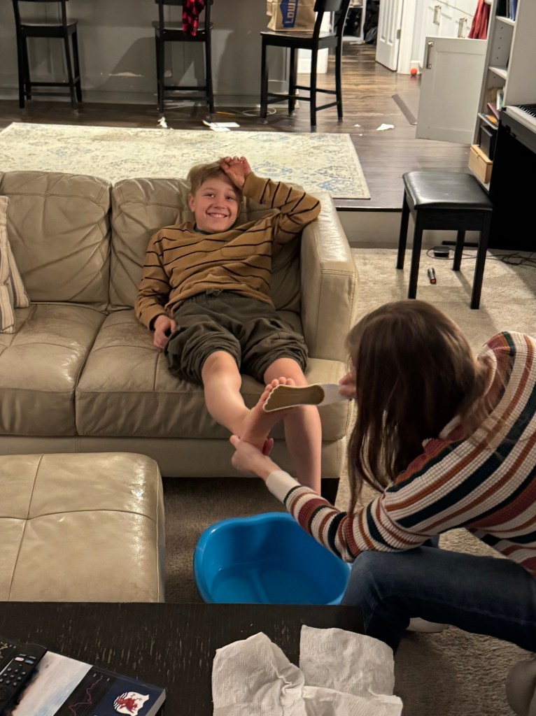 At 8:30 on Saturday night, the last non-school night of Thanksgiving break, Scotty was startled and disappointed to learn his evening was coming to an end. He was sitting on the couch with his feet in a warm salt bath, about to have the dry skin scraped from his soles by his mother. “What!” he said when I told him the time. His torso stiffened like he was about to spring up from his seat and run away, only the water in the little foot tub anchored him in place as if it had turned to concrete. “How!” he said indignantly from behind his glasses, the jolt he’d just suffered causing a little ripple around his ankles. “It was just 6:30!” Two hours had passed without his noticing. He thought the fun was only just getting underway, that he had time yet to kill.