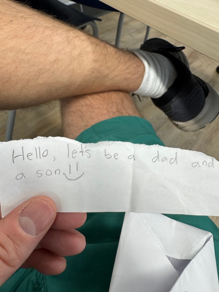 I unfolded it in a hurry, and, finding the inside blank, told Scotty that I didn’t have time and that I had to work. He presented it to me again directly and pressed me to read the message inside. Tucked into a fold was a thin strip of loose paper. I don’t know if it was there before and I’d missed it, or if he had been playing games with me and had only now added it. The message read “Let’s be a dad and a son.”
