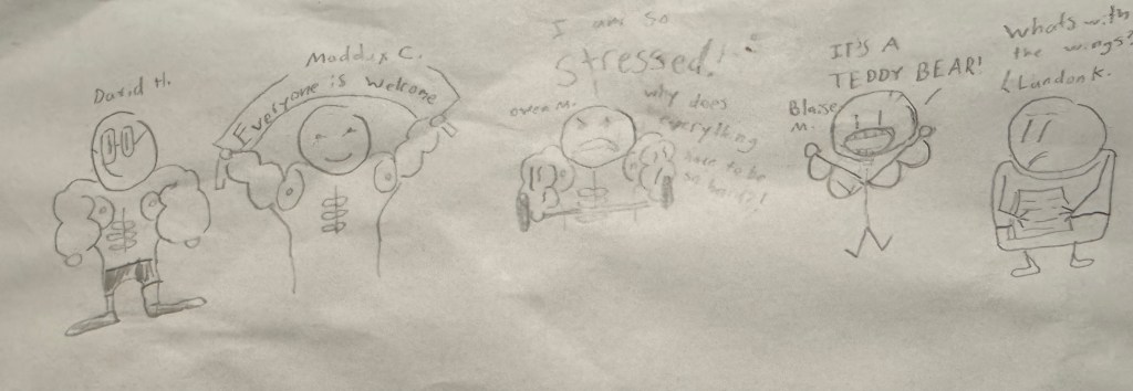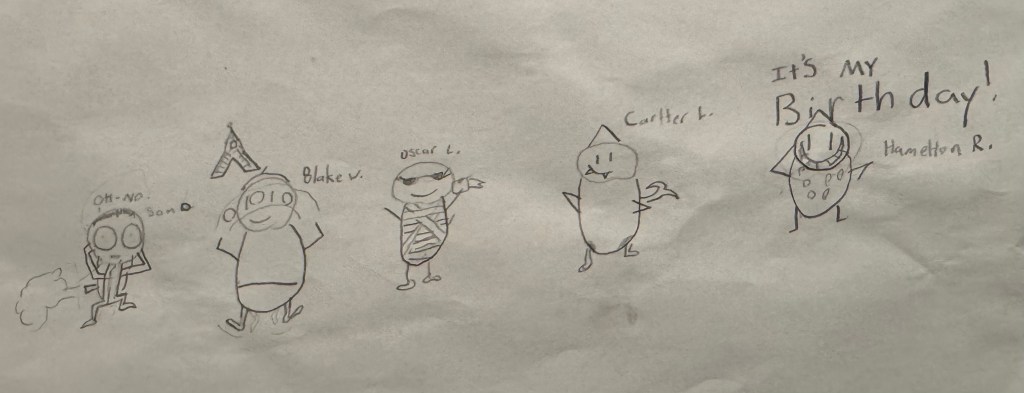 The drawings are replete with faint lines to indicate motion, a technique he apparently learned from reading Dog Man comics. Not that long ago, when I was reading the boys A Wrinkle in Time and Watership Down and White Fang, Danyelle would lie in bed with them and read silly comics like Dog Man and Cat Kid Comic Club. I missed out almost entirely on those expansive series, save for the Dog Man movie, which I thought was actually really clever and well done. If Scotty’s art is a Dog Man imitation, it is still, as one coach on the staff who noticed it said, “low key pretty good.”