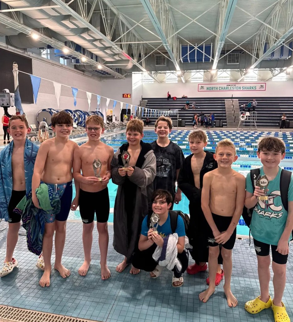 The boys in the pictures are all part of the 9-10 group I coach. I refer to this subset of swimmers as the “nine-ten men.” A talented little cadre, they enjoy gathering before their races to receive instructions before marching toward the starting blocks together chanting, “Men! Men! Men! Men!” They’re inevitably clustered in the same couple of heats, and when they stand up on the blocks together, I holler to them, “Let’s Go Men!” I’m calling Scotty’s drawings of them, “Portraits of the Sharks as Young Men.”