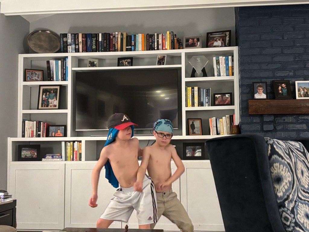 The boys are finally getting tall enough to help out with the dishes, and, however slowly, they’re improving at lending a hand with chores around the house. At the same time, they’re able to handle their business outside the house with increasing proficiency. When their football rolled down the storm drain for the umpteenth time, I tried for a few minutes to reel it in lying on my belly and reaching with a long stick; however, the ball had disappeared from view deep into the muck-filled tunnel that leads into the nearby marsh, and I soon gave up. A short while later, I heard an eruption of cheers outside and returned to the scene to find that Cartter had dived headfirst into the drain while the boy next door held his ankles. In this way he managed to retrieve the ball.